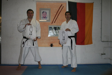NEUENKIRCHEN/ST. ARNOLD. Ingo Gude und Olaf Kaufhold (v. l.) aus der Sportschule Yuishinkan Rheine erreichten am Samstag, 21. November, bei der Dan-Prüfung in St. Arnold ihr Ziel. Ingo Gude erhielt die Urkunde zum 2. Dan, Olaf Kaufhold freute sich über die Auszeichnung zum 1. Dan. Sensei Ludger Möller war mit den gezeigten Leistungen sehr zufrieden.