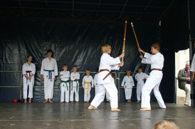 RHEINE. Beim Weltkindertag am Salinenpark stellte sich auch die Sportschule Yuishinkan vor. Aufgrund des Zeitumfangs konnte hier aber nur eine kleine Präsentation des sportlichen Spektrums gezeigt werden.