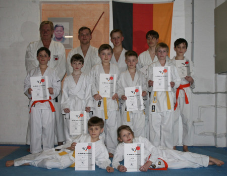In den Prüfungen wird auf Technikausführung, Haltung, Aufmerksamkeit, Kampfgeist, Konzentration und Willen geachtet. Der Gesamteindruck entscheidet. Prüfer und Sensei Ludger Möller konnte an einigen Stellen noch auf kleine Verbesserungen hinweisen, war aber sonsten mit den Leistungen seiner Prüflinge zufrieden. So konnte er am Ende der Prüfung allen Prüflingen die Urkunde zum nächsterlangten Kyu überreichen. Mit den Prüflingen freuten sich Kindertrainer Jan Klümpers und Prüfungspartner Jan Hornung über die erfolgreiche Prüfung. Und die Kinder sind begeistert, bald ihre neuen Gürtelfarben tragen zu dürfen.