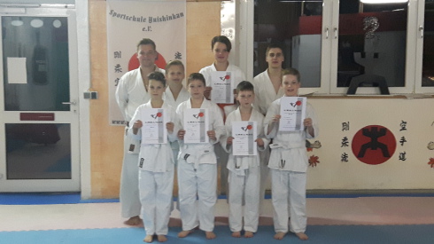 Für Denis Witlif, Adrian Brack, Henri Beckmann und Marlon Kamp war es die erste Prüfung, und sie waren deshalb sehr nervös. Doch am Ende ihrer Darbietungen durften alle die Urkunden zum 8. Kyu