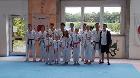 Kindertrainer Maurice Peter und Max Richter sowie Sensei und Prüfer Jan Klümpers waren mit den gezeigten Leistungen sehr zufrieden. Nach den Ferien beginnt das Training wieder am 29. August. Die Erwachsenen treffen sich auch in den Sommerferien dienstags und freitags von 19.30 bis 21 Uhr zum Training.